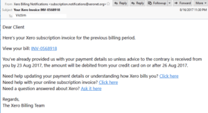 A linha do assunto das mensagens normalmente é “Notificações de cobrança Xero” e com o endereço de e-mail de origem exibindo como “xeronet.org” em vez do negócio legítimo “xero.com”. O domínio foi registrado na China no mesmo dia em que a campanha começou (16/ago/2017). O corpo da mensagem tenta falsificar um questionamento legítimo da Xero, solicitando ao destinatário que siga um conjunto de URLs mal-intencionados. (vide abaixo)